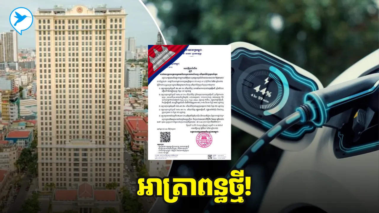ក្តៅៗ! រាជរដ្ឋាភិបាលកម្ពុជាប្រកាសចេញអត្រាពន្ធថ្មីលើរថយន្តអគ្គិសនី (EV) និងគ្រឿងបង្គុំពាក់ព័ន្ធ