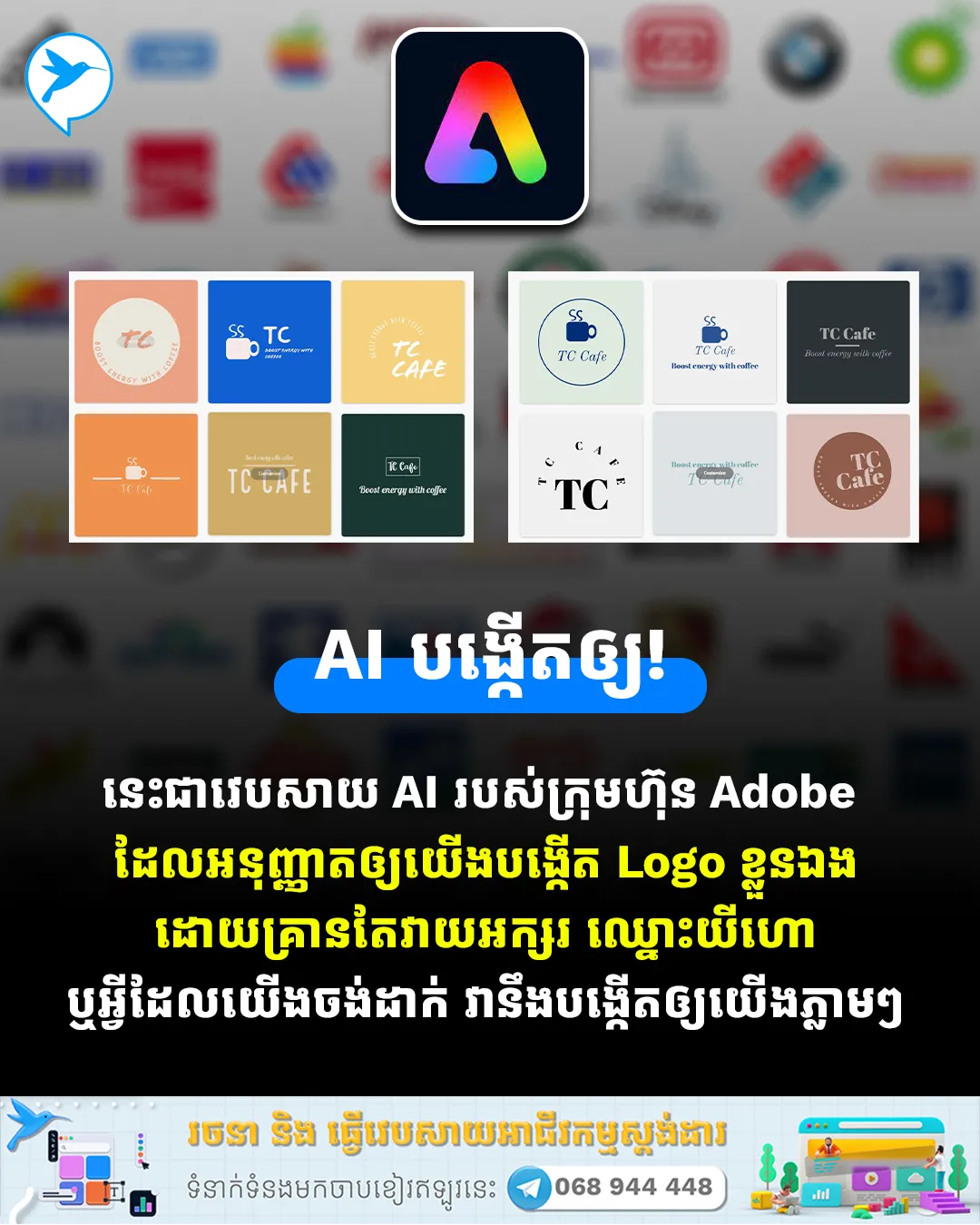 express.adobe.com គឺជាវេបសាយមួយ ដែលអាចបង្កើត ឬ Generate Logo បានសឹងតែគ្រប់ទម្រង់ឲ្យយើង ប្រើពេលមិនដល់មួយនាទីផង។ លោកអ្នកអាចចូលទៅកាន់លីង www.adobe.com/express/create/logo រួចសាកល្បងបង្កើត Logo ក្នុងក្ដីស្រមៃងាយៗដោយខ្លួនឯង។ សម្រាប់ការបង្កើតវិញគឺមិនមានភាពស៊ាំញ៉ាំច្រើនទេ ពោលគឺយើងគ្រាន់តែវាយឈ្នះហាង ឬឈ្នះផ្ទាល់ខ្លួន បន្ទាប់មកជ្រើសរើសទម្រង់ Logo និងពណ៌ ជាការស្រេច។ បើចង់កែកុនបន្ថែមដោយខ្លួនឯងក៏បាន!