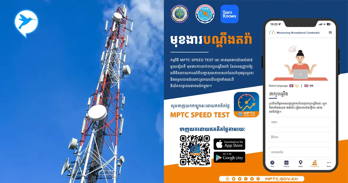 សម្រាប់បងប្អូនដែលកំពុងជួបបញ្ហាតាមតំបន់ដែលបងប្អូនកំពុងរស់នៅគ្មានសេវាទូរស័ព្ទ ពេលនេះនៅលើ App ក្រសួងដែលមានឈ្មោះថា MPTC Speed Test មានមុខងារដាក់បណ្ដឹងទៅកាន់ក្រសួងហើយ។
